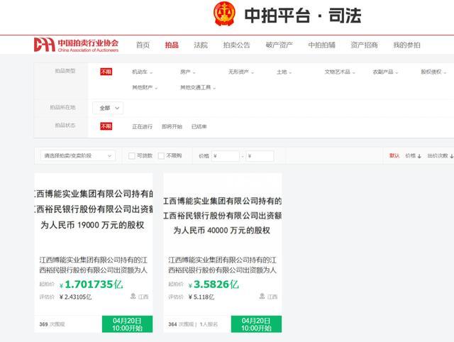 泰山财经记者从中国拍卖行业协会网司法拍卖网络平台获悉,江西裕民银行第二大股东江西博能实业集团有限公司(下称“博能实业”)持有全部的5.9亿股,将于4月20日在该平台拍卖。该笔股权占该行总股本的29.5%,拆分为两笔处置,起拍价均较评估价打七折,合计约5.28亿元。